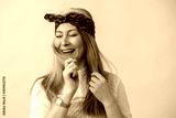 Emotional portraits of a paled long hair asian matured woman on grey background