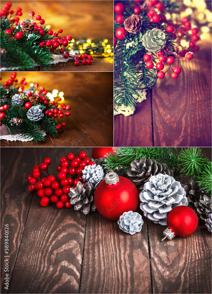 Collage mix set of Christmas fir with pinecone and garland. Stock photo.