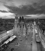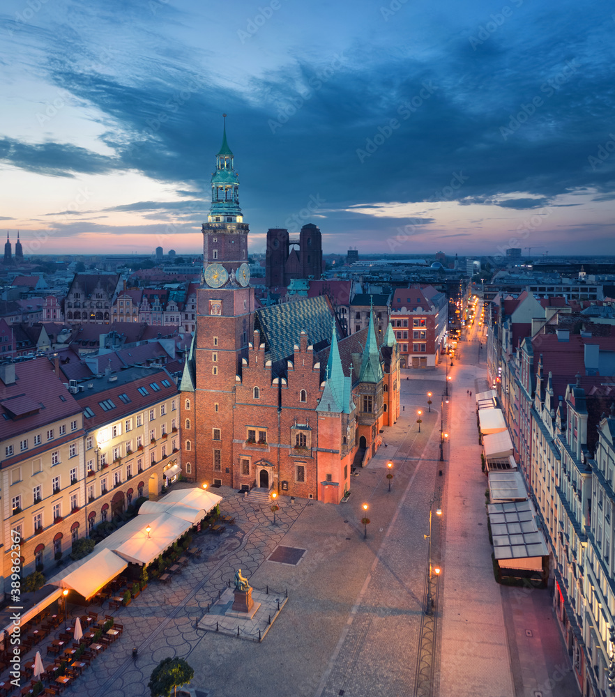 Aerial view of gothic Town Hall at dusk in Wroclaw, Poland