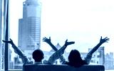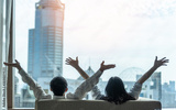 Relaxing couple lifestyle celebrating happy resting in luxury city condominium, urban condo, home apartment, or business hotel tower for family life-work balance and marriage living quality concept
