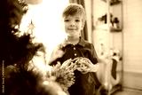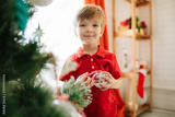 Cute little boy of about five year with a gift in a decorated Christmas room with a xmas tree