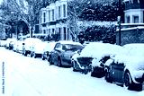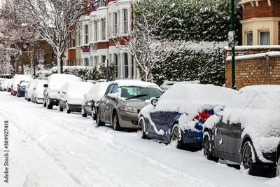 Street winter cityscape with snow terraced houses and frozen cars after a blizzard snowfall in London England UK, stock photo image with copy space