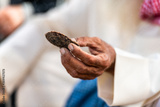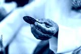arabian pearl diver showing how to open a shell to find salt wate pearls, an old tradition in the gulf countries such as UAE, focus on the hands of an elderly man