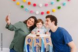 Mother father dad taking selfie with child kid toddler. Caucasian family with baby boy celebrating his first birthday at home. Cupcake dessert with one candle. Happy birthday lifestyle.