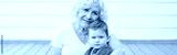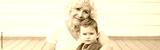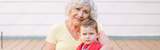 Grandmother sitting with grandson boy at home backyard. Bonding of relatives and generation communication. Old woman with baby spending time together outdoors. Web banner header.
