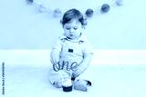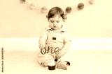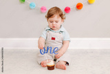 Happy cute Caucasian baby boy celebrating his first birthday at home. Child kid toddler sitting on floor in room. Tasty cupcake dessert with cake topper word one. Happy birthday.