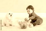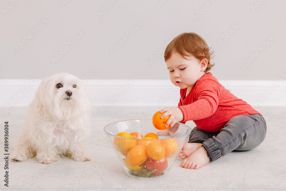 Cute adorable Caucasian baby boy eating citrus fruit. Finny child sitting on floor with pet dog and eating healthy organic snack. Solid finger food and supplementary food for children toddler.