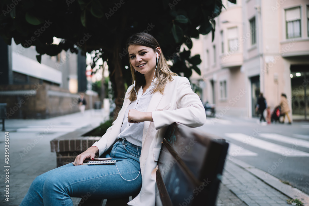 Portrait of charming hipster girl in casual clothing and electronic headphones smiling at camera while resting at urban bench and listening positive music playlist, cheerful female enjoying pastime