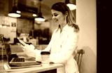 Happy freelancer sharing media files via mobile and laptop technology using bluetooth connection in coffee shop, successful female copywriter publishing network content via smartphone application