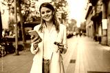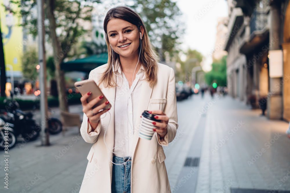 Portrait of happy female millennial with mobile technology and takeaway caffeine beverage smiling at camera while exploring city during travel vacations, pretty Caucasian woman in headphones