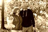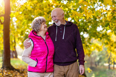 Happy senior couple spending time together in beautiful city park in autumn
