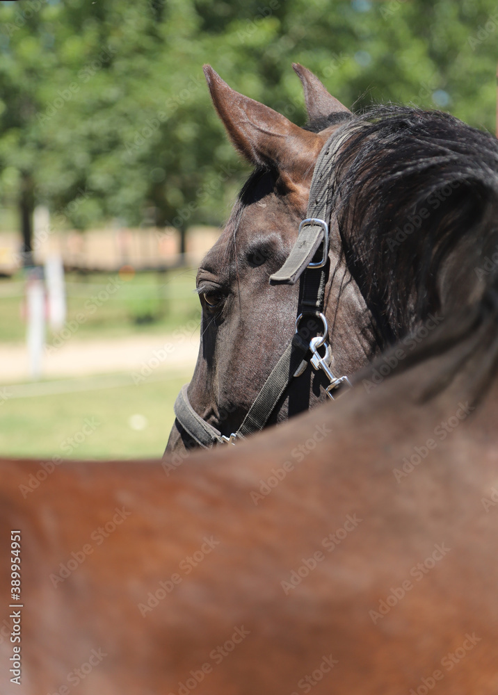 Headshot of a beautiful stallion. Adult morgan horse standing in summer corral near feeding station and other horses