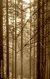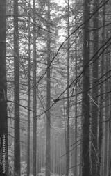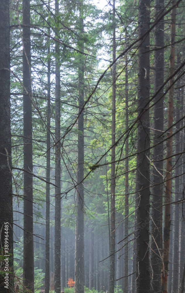 Autumn forest in the Ukrainian Carpathian mountains with fog and trees with yellow-red leaves