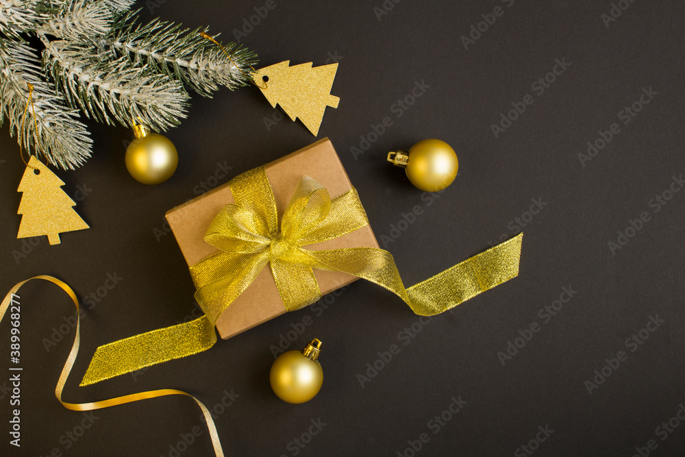 Top view of Christmas gift with gold bow on the dark background