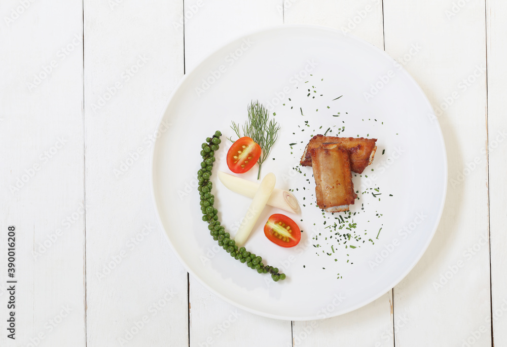 Fried Pork Ribs with pepper in white dish on wooden floor.