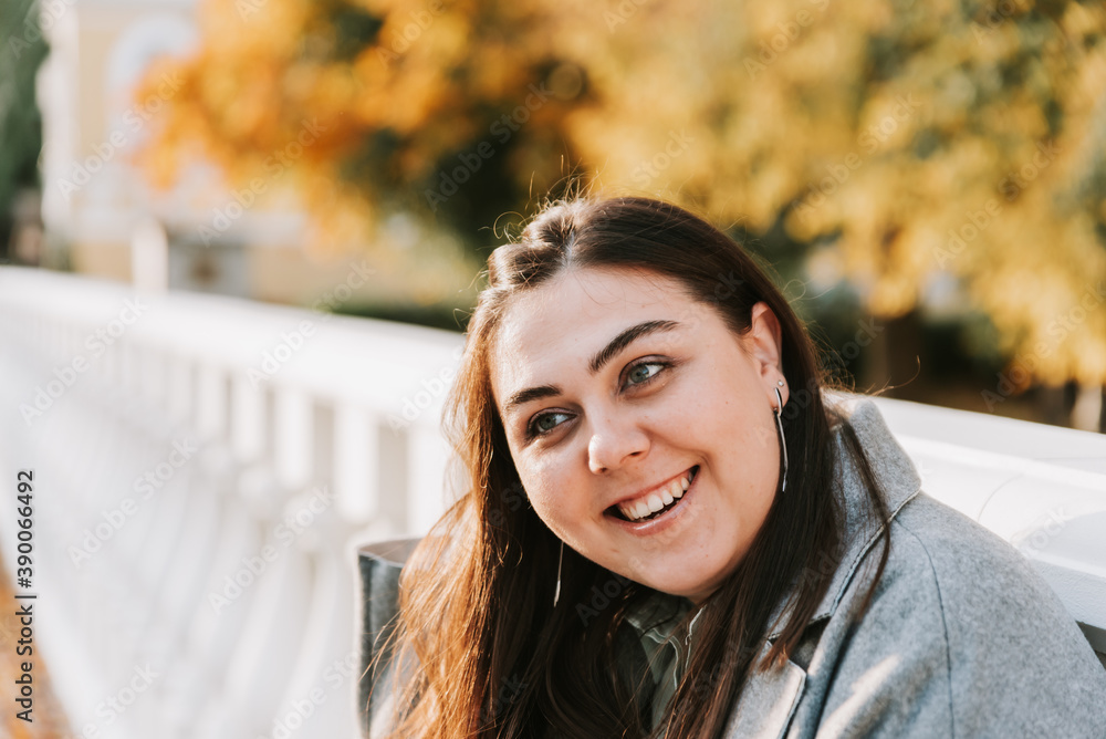 Portrait of a beautiful adult young woman on the background of autumn in the Park