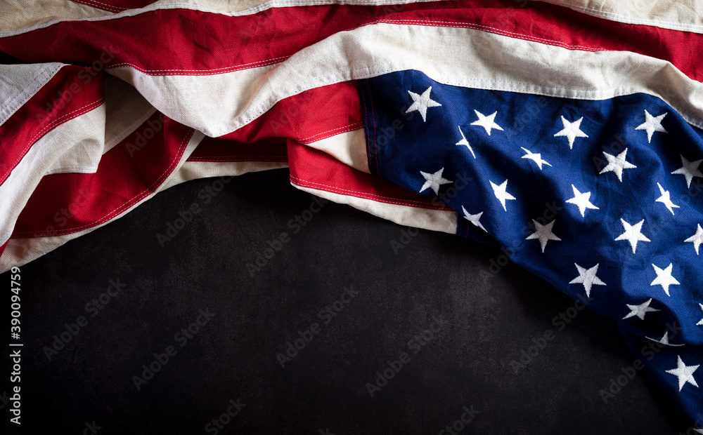 Happy Veterans Day concept. American flags against a dark stone background. November 11.