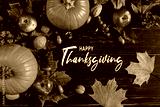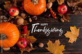 Thanksgiving greetings. Dry yellow leaves, pumpkins, berries, nuts and frame on a wooden background, top view. Kaligraphic capital inscription.