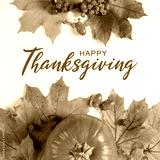 Thanksgiving greetings. Dry yellow leaves, pumpkins, berries on a white background, top view. Kaligraphic capital inscription.