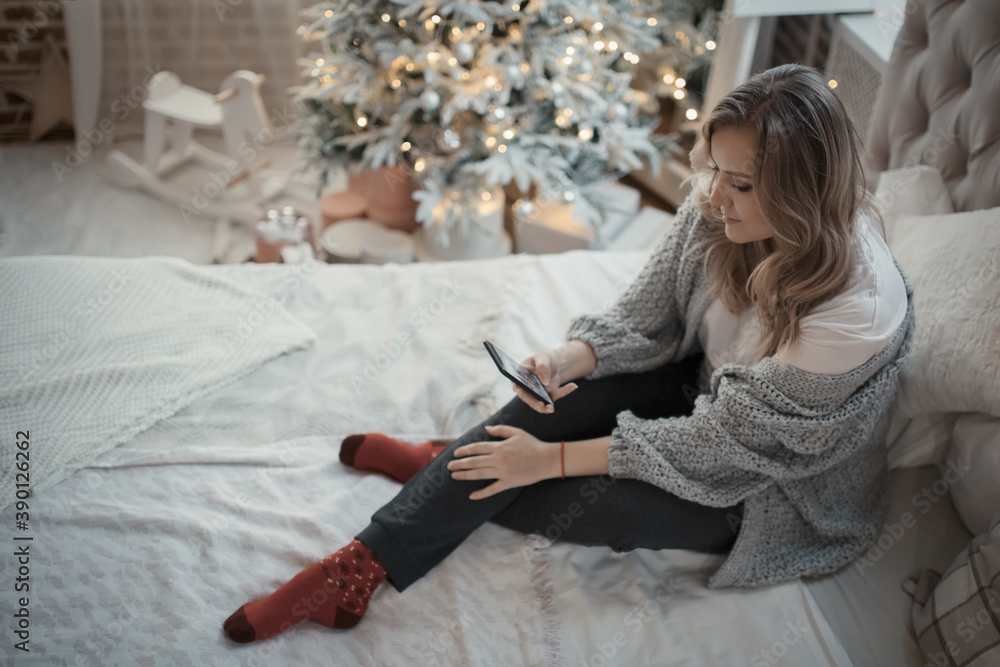 A woman in a sweater sits on the bed and uses a smartphone. Christmas season