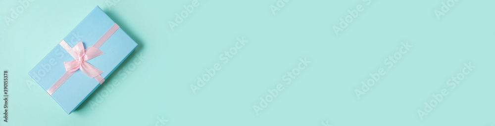 Christmas New Year birthday valentine celebration present concept. Simply minimal design blue gift box isolated on blue pastel geometric background. Flat lay top view copy space, banner