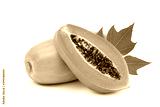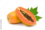 Ripe papaya fruit with cut in half and green leaf isolated on white background.