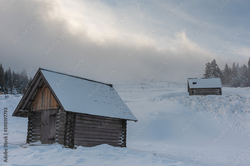 Snowy winter in the Ukrainian Carpathians and picturesque mountain houses
