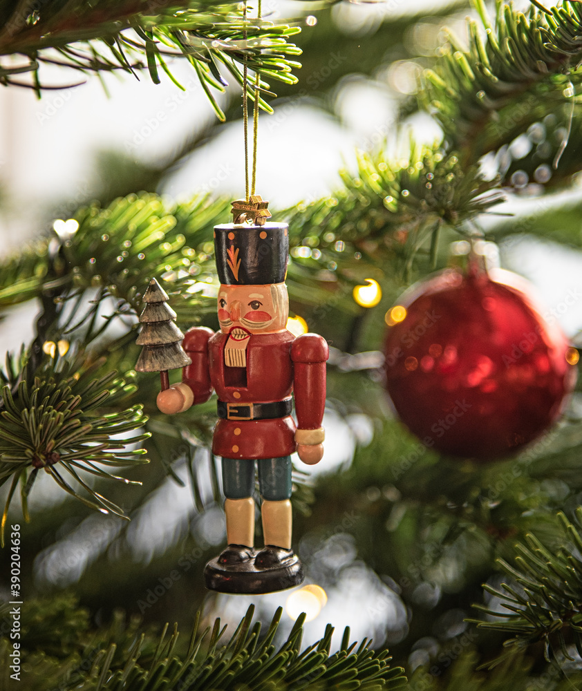 Vintage wooden toy doll with Christmas clothes, traditional figurine of Christmas time