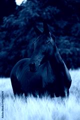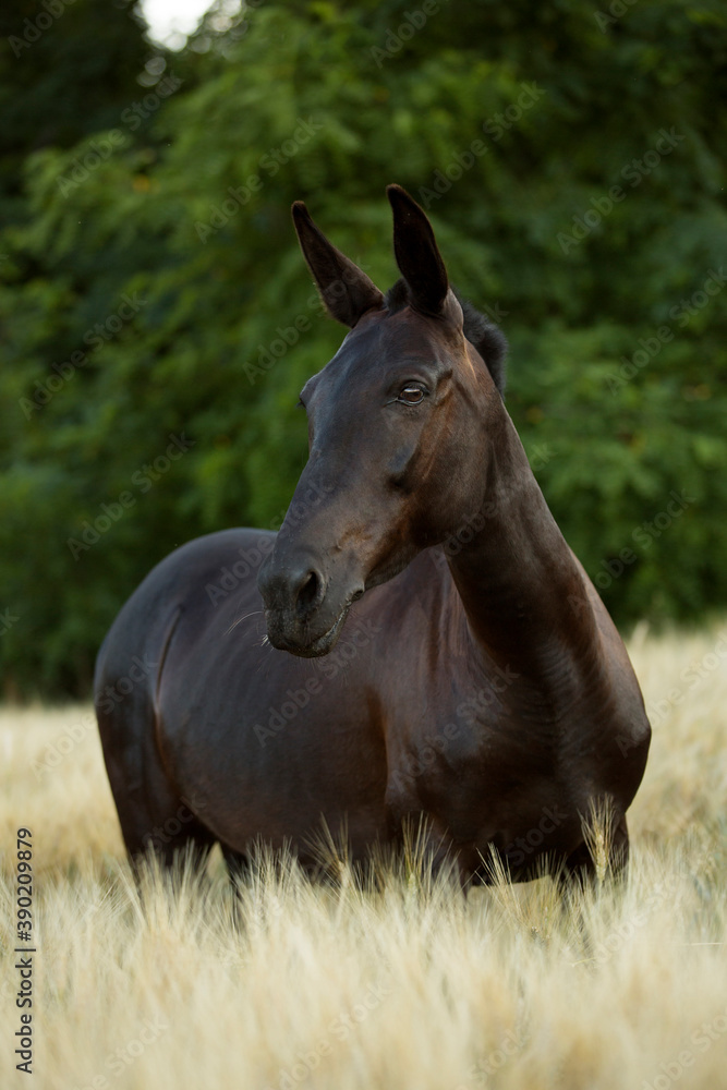 adorable dark brown mule with long ears standing in wheat golden field by the sunset