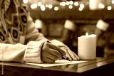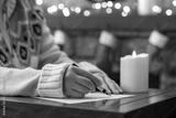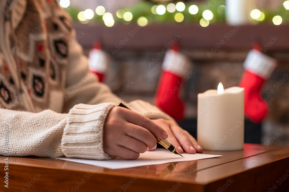 Woman writing letter to santa claus using fountain pen on sheet of paper at christmas fireplace with decoration of light bulbs and candle on table.