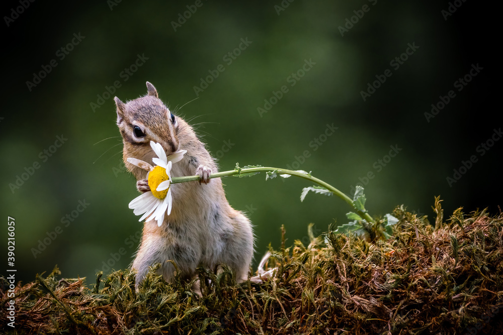 Siberian chipmunk (Eutamias sibiricus) in the forest in Noord Brabant in the Netherlands