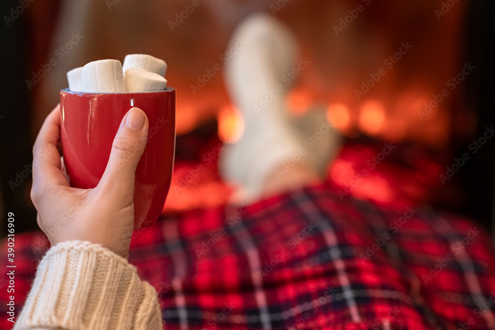 Woman with cup of hot cocoa and marshmallow warming legs in winter white socks near fireplace flame, covered christmas plaid