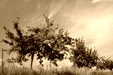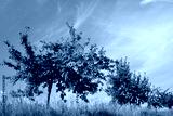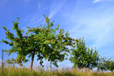 Several crooked apple trees stand next to each other in a meadow, against a blue sky, with ripe apples on them