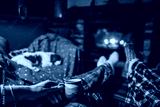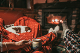 Cute Little Puppy Resting By The Fireplace at Home. Cavalier King Charles Spaniel baby dog sleeping, sitting, taking a nap by the cozy burning fireside in Swiss mountain chalet. Festive Cristmas