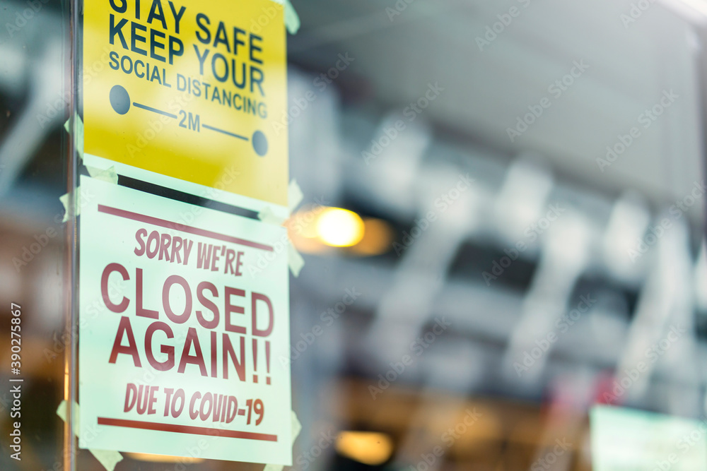 window store glass door entrance handing closed sign shop again from covid-19 spread and lockdown 2nd announcement from goverment health and quarantine concept