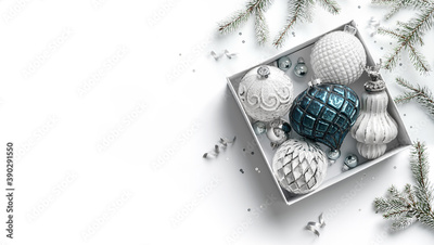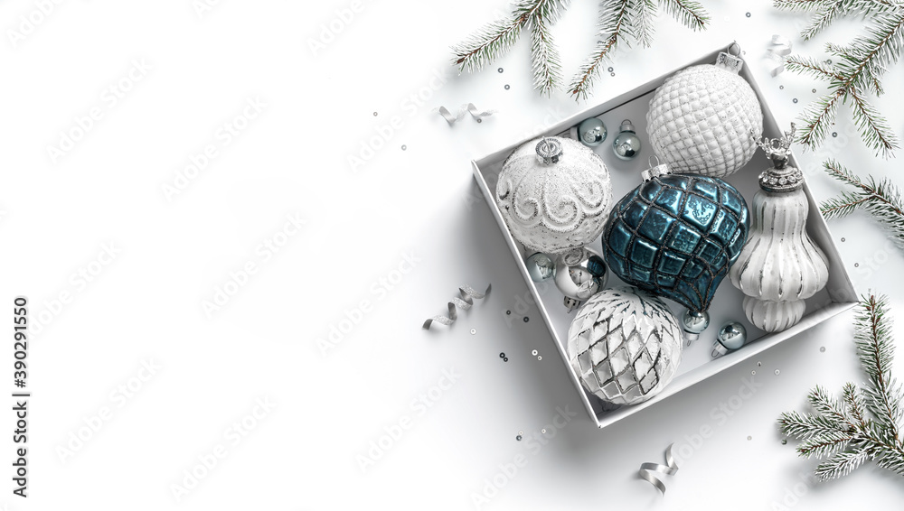 Merry Christmas card made of gift box, white and silver decorations, fir branches, sparkles and confetti on white background. Xmas and New Year holiday, bokeh, light. Flat lay, top view
