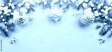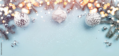 Christmas fir branches and white decoration on blue background with silver sparkles, bokeh, light, glitter. Merry Christmas and New Year greeting card, winter holiday. Flat lay, top view, Xmas banner