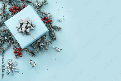 Christmas gift boxes with silver ribbons, decoration, bows, sparkles, fir branches, confetti on blue background. Xmas and New Year greeting card, winter holiday. Top view, banner