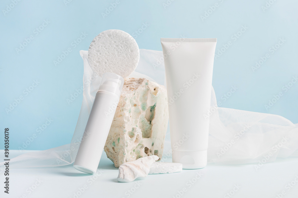 Cosmetic bottle podium made of natural stone material on a blue background