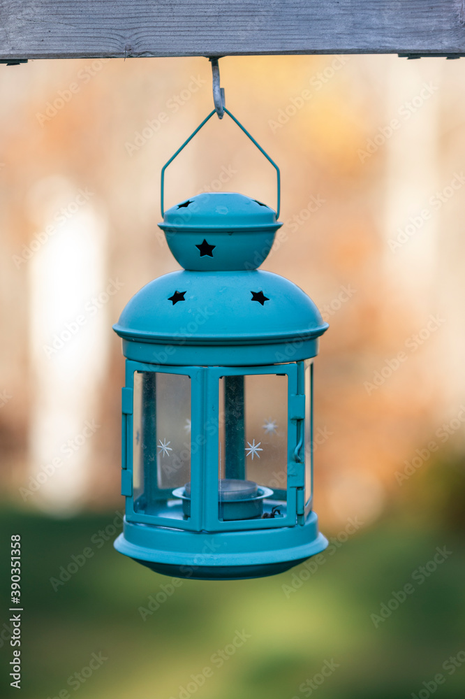 vintage blue lantern hanging outdoors