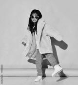 Frolic asian kid girl in stylish yellow furry coat, jeans, sneakers and sunglasses dances stands with her foot up