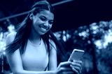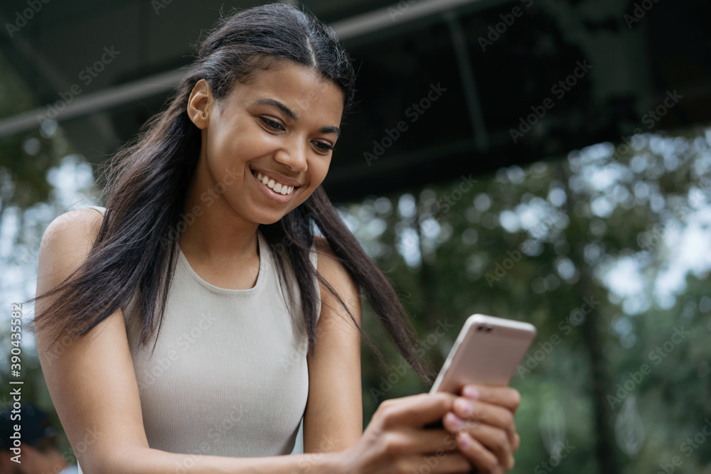Beautiful smiling African American woman using mobile phone, communication, watching movie online, sitting outdoors
