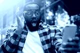 Young shocked man with open mouth using mobile phone, looking at digital screen, sitting at workplace. Portrait of emotional African American freelancer missed deadline