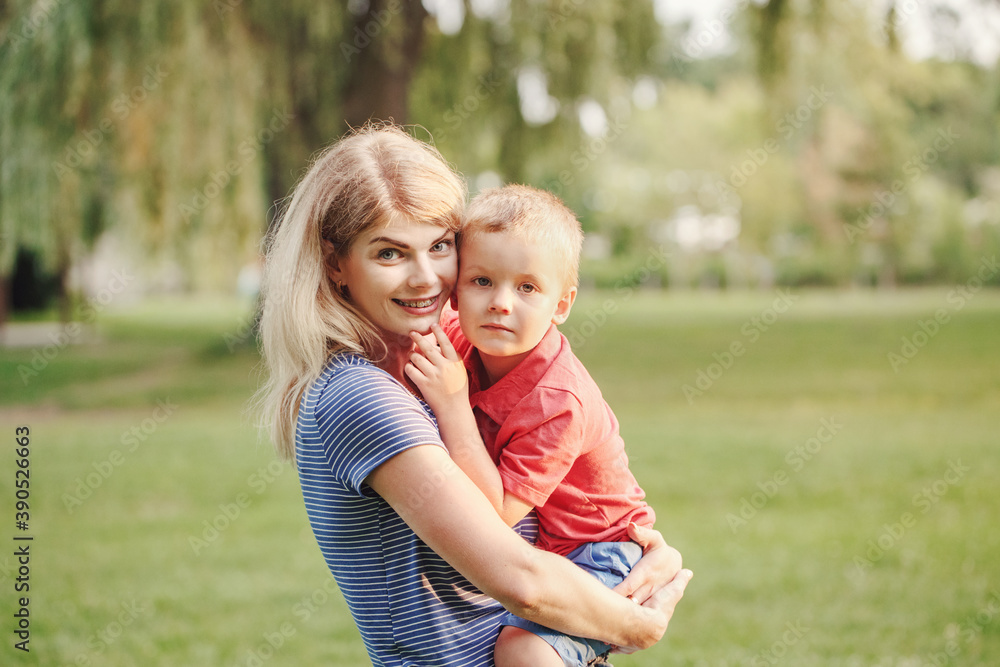Mothers Day. Young Caucasian mother holding boy toddler son in hands arms. Family mom embracing hugging child in park on summer day outdoors. Happy authentic family childhood lifestyle.