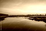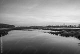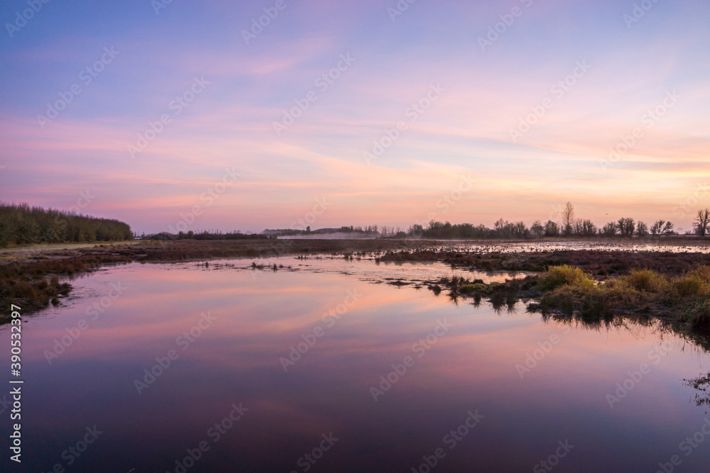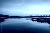 Early sunrise reflects subtle tones on the still surface of water in the foreground.