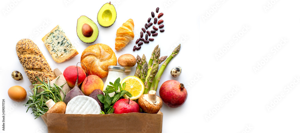 Proper nutrition. Healthy eating. Healthy food paper bag. healthy food background. supermarket food concept. shopping in the supermarket. home delivery. Food delivery. Supermarket. Grocery shopping