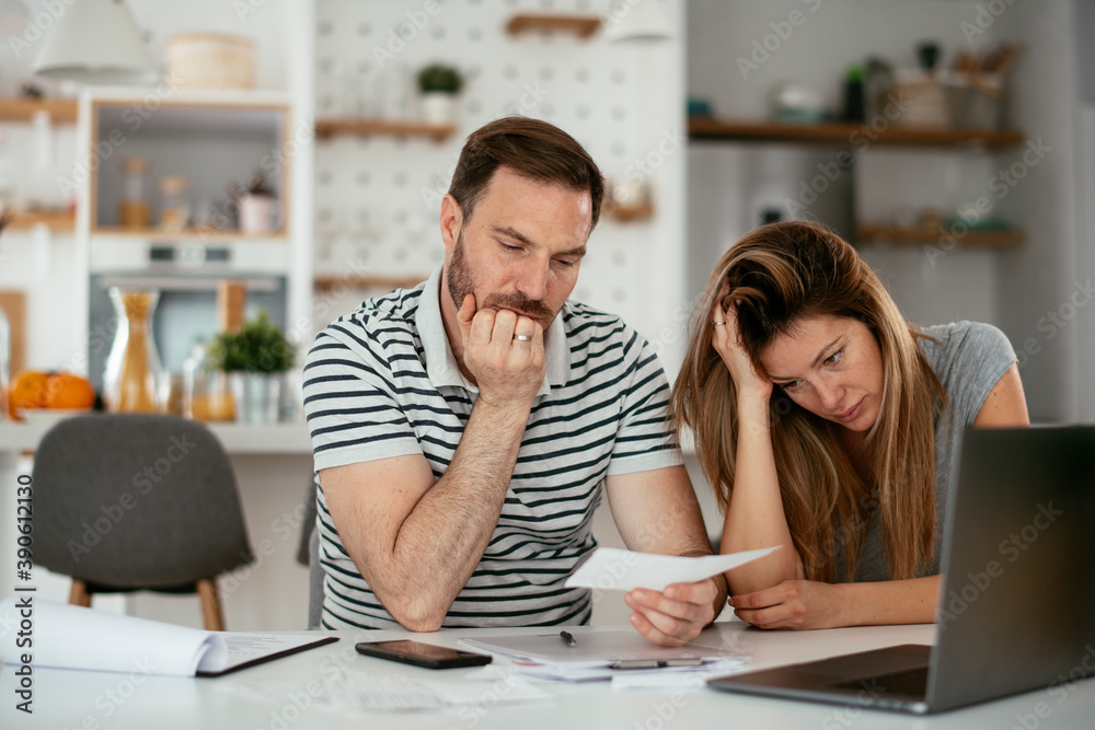 Husband and wife preparing bills to pay. Young couple having financial problems.