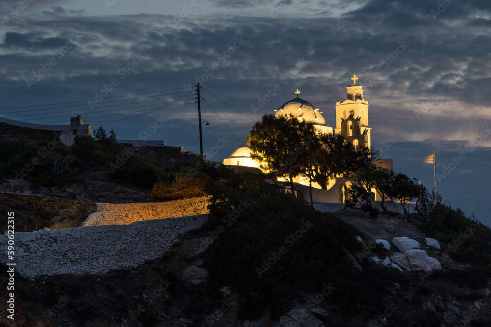 View of the Agia Irini, Saint Irene, Greek Orthodox church at night. Beautiful illumination, Chora, Ios, Greece.