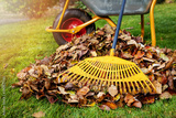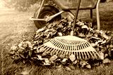 raking fallen autumn leaves in the garden on sunny fall day. leaf pile and rake
