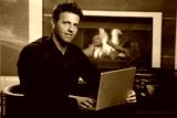 Businessman working from home, sitting at fireplace in home office using laptop, teleworking online.